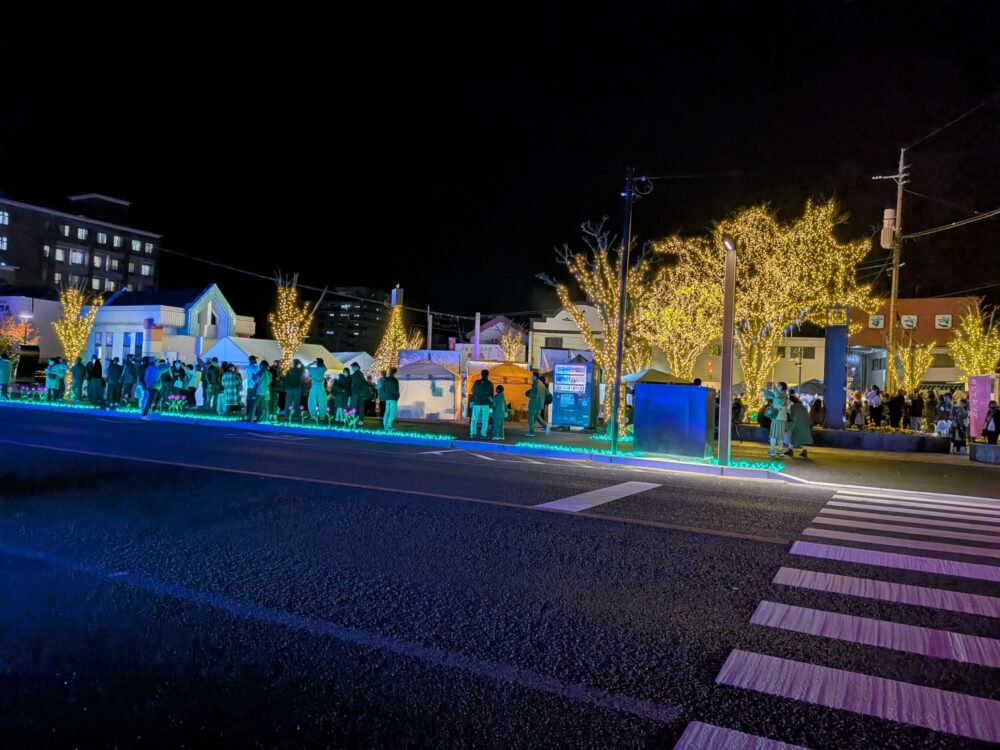 須崎町公園にステージやお店があって、たくさんの人がいて、点灯を待ってました。